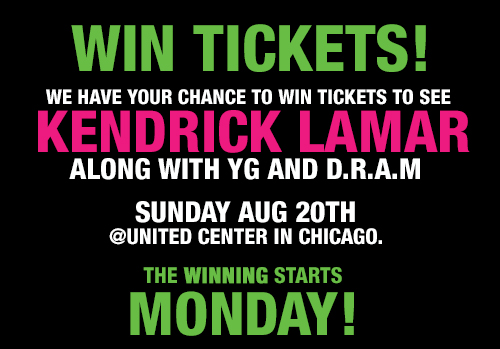 Live 99. 9 number one for new music, has the hottest concert tickets. Kendrick Lamar tickets. We have your tickets to see Kendrick Lamar along with YG and D.R.A.M Sunday Aug 20th at United Center in Chicago.